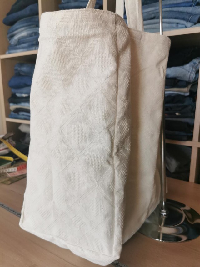 Confectionné à partir de chutes de toile à matelas confiées par un artisan matelassier ardéchois, ce sac allie solidité et praticité.